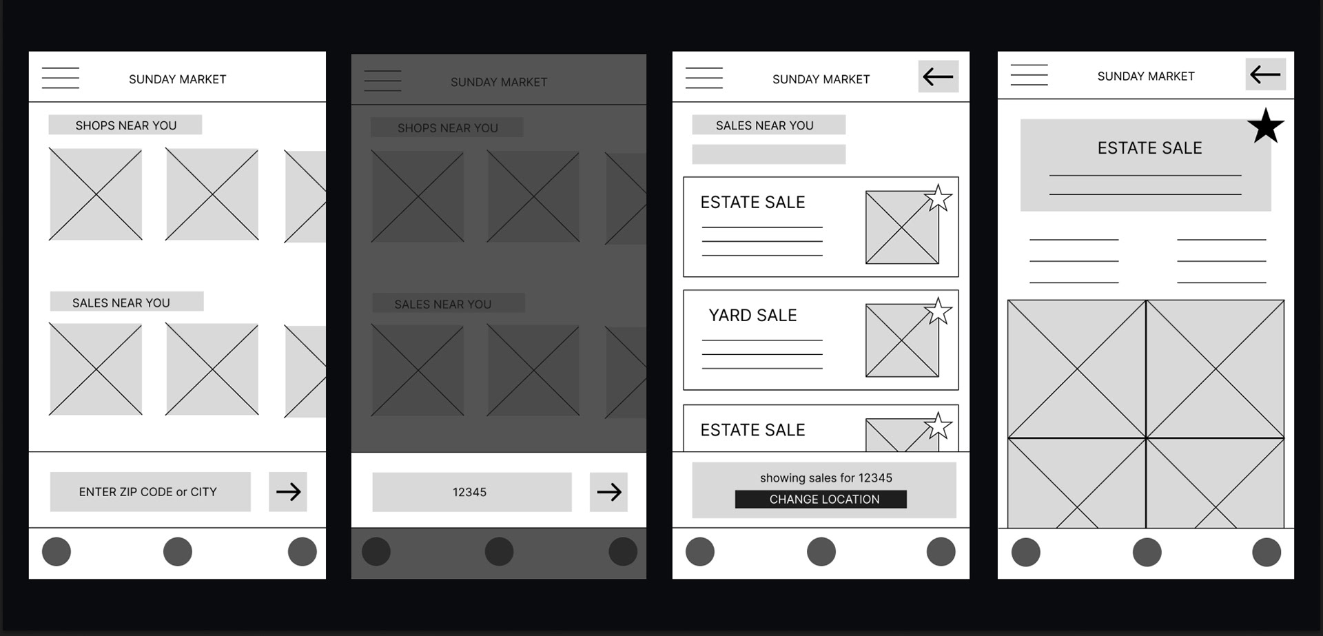 Through the creation of empathy maps and competitive audits, I was able to understand the user group for Sunday Market. Research confirmed initial assumptions about the Sunday Market app and revealed the need for a ‘sale creation’ page so individuals could market their own yard or estate sales.